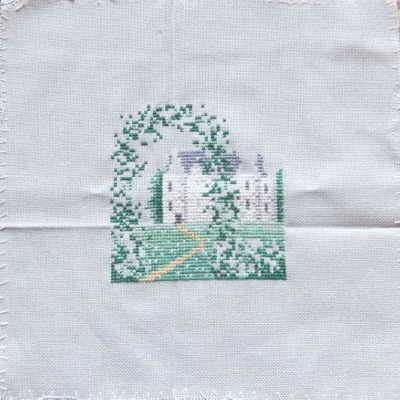 図案:オリンパスししゅうキット 「バラのアーチの城」今年の針初めだったこの図案の糸が、ほぼ半分のこっているので、もう1つ刺して使い切ろう〜!と急に思い立った。